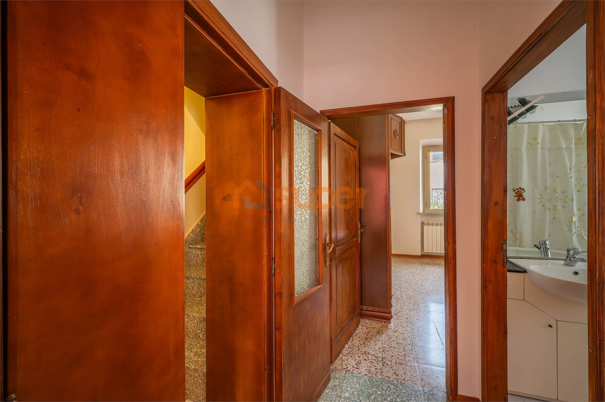Attraverso una scala interna si accede al primo piano, dove si apre la vera anima della casa: cinque camere spaziose – tre matrimoniali, una doppia e una singola con balconcino – oltre a due bagni, ideali per accogliere una famiglia numerosa o per chi desidera disporre di ambienti dedicati a studio o ospiti.