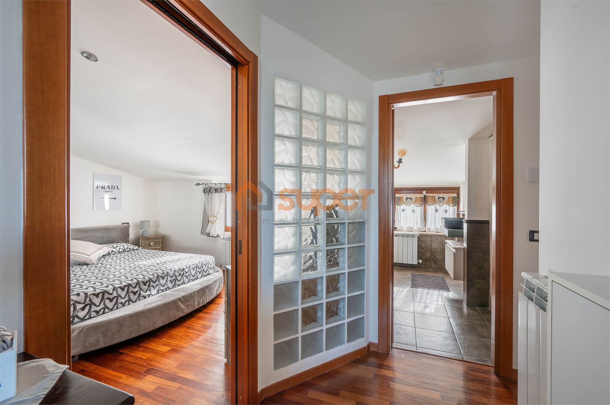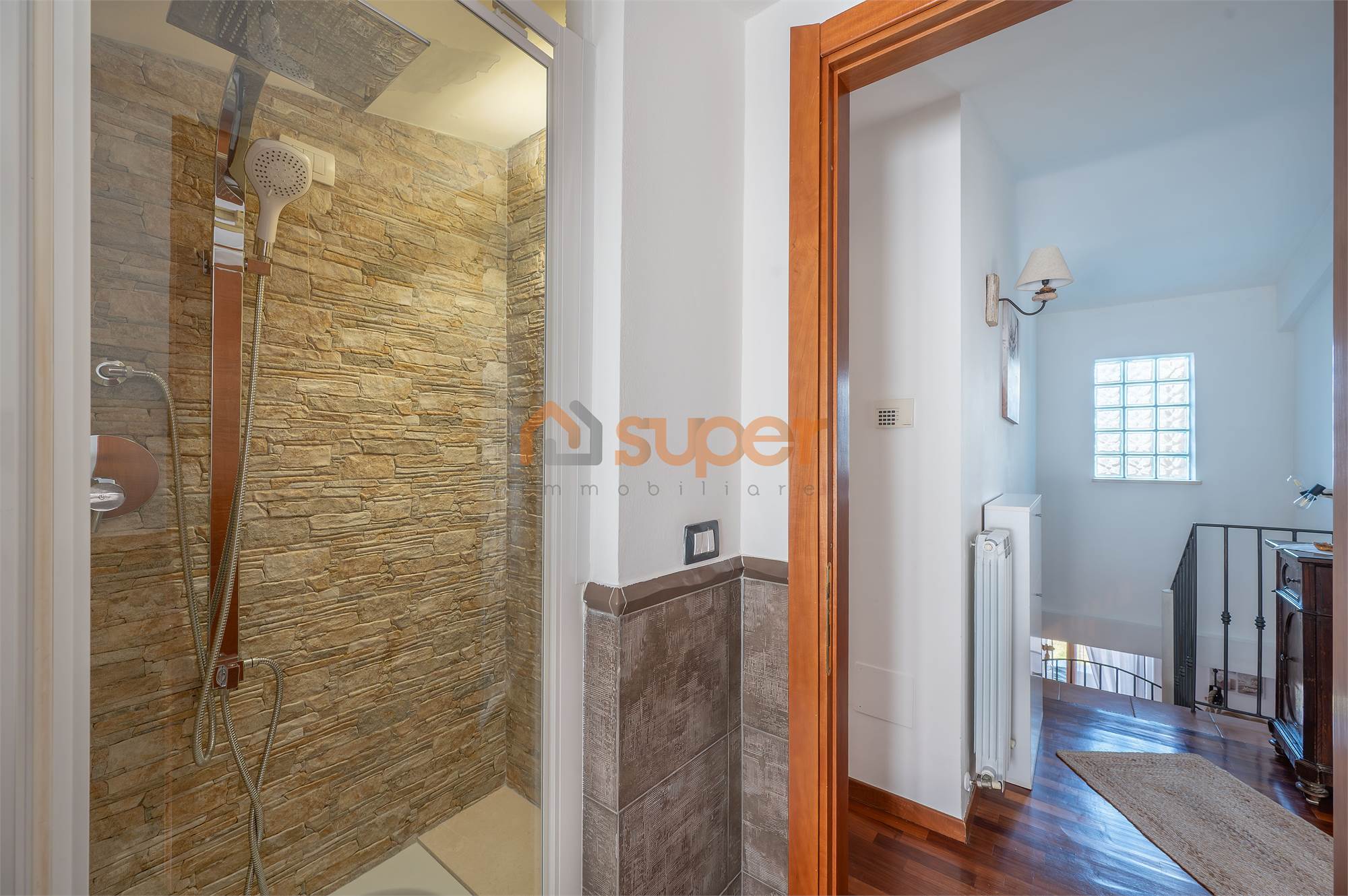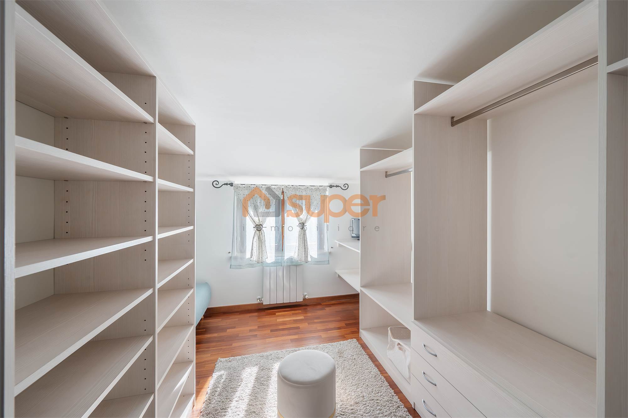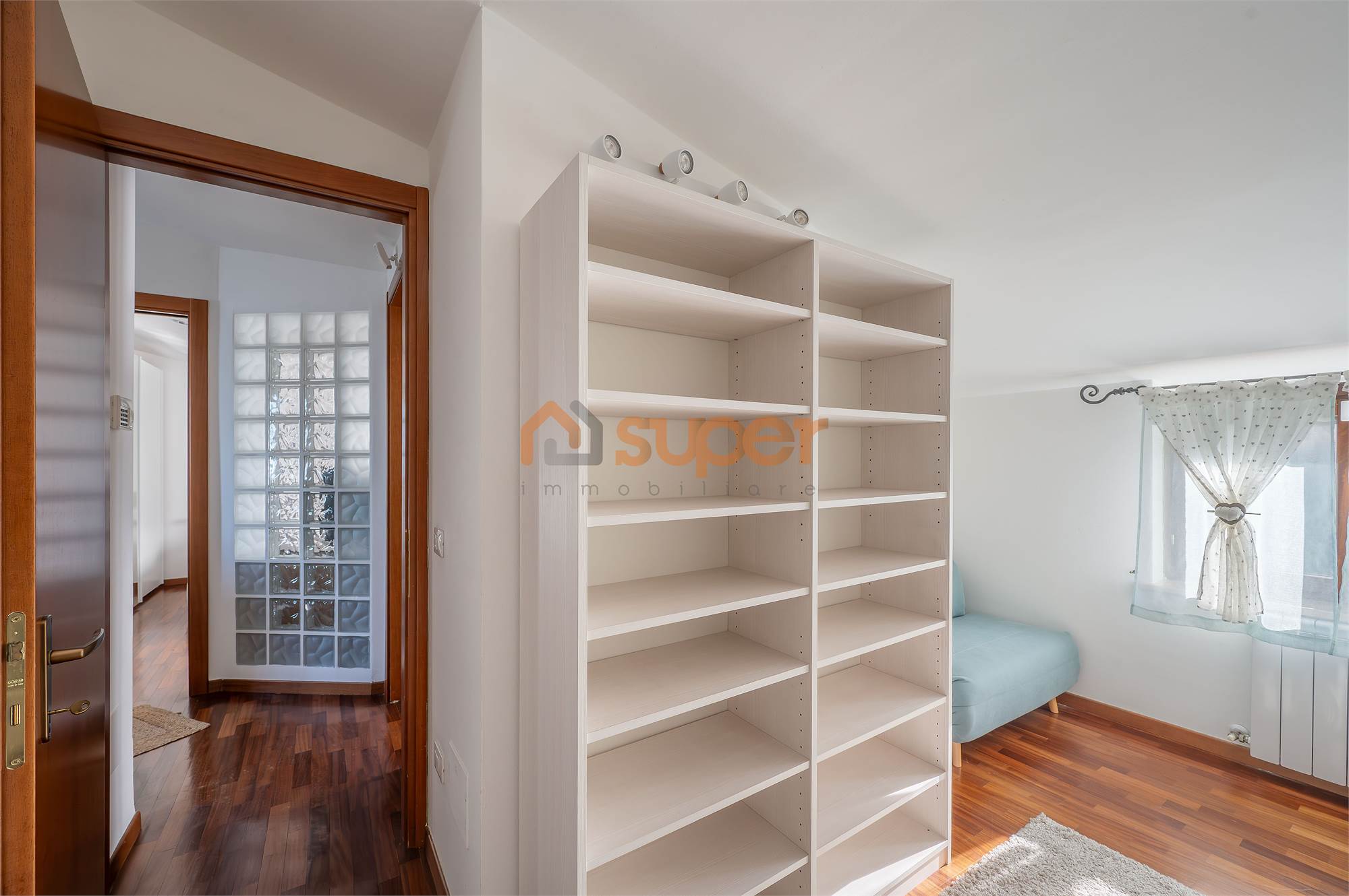 Una scala interna accompagna al secondo piano, dedicato alla zona notte, dove si trova una camera matrimoniale finemente decorata, caratterizzata da un’atmosfera ricercata e confortevole. La seconda camera, attualmente adibita a cabina armadio, offre versatilità d’uso e ottime potenzialità. Il piano è servito da un bagno finestrato con doccia, moderno e ben rifinito.